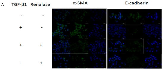 Immunofluorescence was executed as described previously [33]. Briefly, cells cultured on cover slips were fixed with 4% paraformaldehyde and incubated with primary antibodies against α-smooth muscle actin (α-SMA) (ab5694; Abcam, Cambridge, MA, USA) or E-cadherin (sc-7870; Santa Cruz Biotechnology, Dallas, TX, USA). Frozen sections of kidney tissues were fixed with cold acetone, and then incubated with primary antibodies against α-SMA or E-cadherin. Then, the cells and cryosections were stained with secondary antibodies conjugated to Alexa Fluor 488 and mounted. Images of the cells and cryosections were obtained by confocal laser scanning microscopy (TCS SP5; Leica, Mannheim, Germany). The fluorescence intensity was detected by confocal laser scanning microscopy immediately.