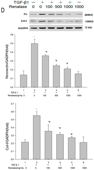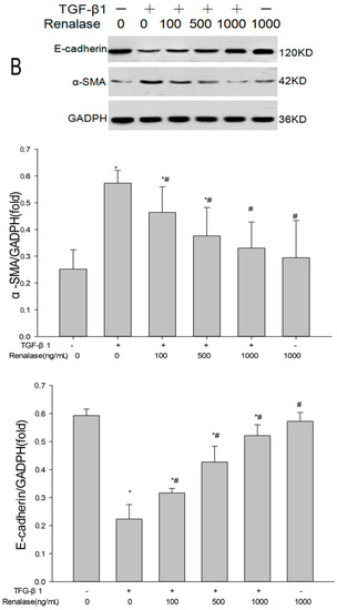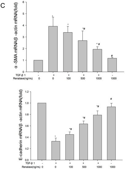 Renalase blocks transforming growth factor-β1 (TGF-β1)-mediated epithelial to mesenchymal transition (EMT) in vitro. Human proximal tubular epithelial cells (HK-2) were treated with 2 ng/mL TGF-β1 in the presence or absence of various concentrations of renalase as indicated for 48 h. (A) Immunofluorescence showed that renalase (1000 ng/mL) abolished TGF-β1-induced α-smooth muscle actin (α-SMA) assembly and preserved E-cadherin integrity; magnification: 120×; (B,D) Western blotting demonstrated that renalase (100, 500 and 1000 ng/mL) reversed the increased expression of α-SMA, collagen-I, and fibronectin, and decreased expression of E-cadherin in a dose-dependent manner; (C) reverse transcription (RT)-PCR revealed that renalase (100, 500 and 1000 ng/mL) reversed the increased Messenger RibonucleicAcid (mRNA) expression of α-SMA and decreased mRNA expression of E-cadherin in a dose-dependent manner. Results are presented as percentages of control values after normalization to GADPH and are the means ± SD of three independent experiments. * p < 0.05, compared with control groups; # p < 0.05, compared with TGF-β1-stimulated groups; n = 3 per group.