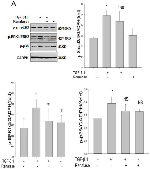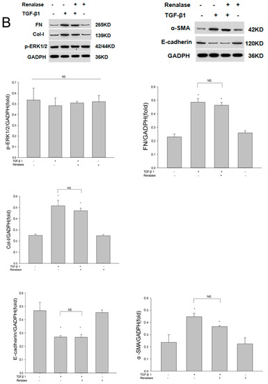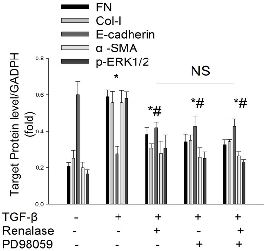 Human proximal renal tubular epithelial (HK-2) cells were obtained from the American Type Culture Collection (Manassas, VA, USA). The cells were cultured in Dulbecco’s modified Eagle medium (Sigma-Aldrich, St. Louis, MO, USA) supplemented with 5% fetal bovine serum (Gibco, Grand Island, NY, USA) as described previously. After serum starvation for 12 h, HK-2 cells were incubated with various concentrations of renalase (100, 500, or 1000 ng/mL; Cloud-Clone Corp., Houston, TX, USA) in the absence or presence of TGF-β1 (2 ng/mL; R&D Systems, Minneapolis, MN, USA) or PD98059 (20 µM; Sigma) for 48 h unless indicated otherwise. The cells were collected for various analyses.