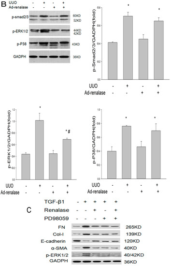 Renalase inhibits the TGF-β1-mediated increase of phosphorylated ERK1/2 in vitro. (A) Human proximal tubular epithelial cells (HK-2) were treated with 2 ng/ml TGF-β1 in the presence or absence of renalase (1000 ng/mL) for 48 h. Western blotting revealed that renalase inhibited TGF-β1-induced ERK1/2 phosphorylation, and did not affect the phosphorylation of Smad2/3 and p38. Results are presented as percentages of control values after normalization to GADPH and are the means ± SD of three independent experiments. * p < 0.05, compared with control groups; # p < 0.05, compared with TGF-β1-stimulated groups; NS: not statistically significant compared with control groups. n = 5 per group; (B) Changes of TGF-β1 signaling pathway in UUO rats. Renalase inhibited ERK1/2 phosphorylation and did not affect the phosphorylation of Smad2/3 and p38. Results are presented as percentages of control values after normalization to GADPH and are the means ± SD of three independent experiments. * p < 0.05, compared with sham + Ad-b-gal groups; # p < 0.05, compared with UUO + Ad-renalase groups; n = 5 per group; (C) Human proximal tubular epithelial cells (HK-2) were treated with 2 ng/mL TGF-β1 in the presence or absence of renalase (1000 ng/mL) or PD98059 (20 μM) for 48 h. Western blotting showed that renalase has a similar effect with PD98059 to minimize the increase of FN, Col-I, α-SMA and ERK1/2 phosphorylation and restore the decrease of e-cadherin induced by TGF-β1. While renalase and PD98059 were given at the same time to TGF-β1-stimulated cells, the protective effect of renalase and PD98059 was not superimposed. Results are presented as percentages of control values after normalization to GADPH and are the means ± SD of three independent experiments. * p < 0.05, compared with control groups; # p < 0.05, compared with TGF-β1-stimulated groups; NS: not statistically significant between groups. n = 5 per group.