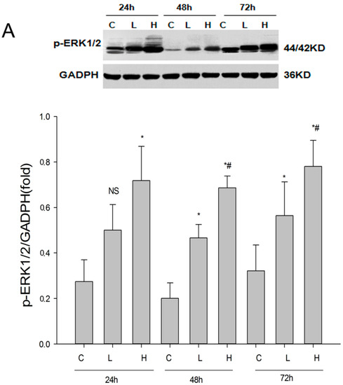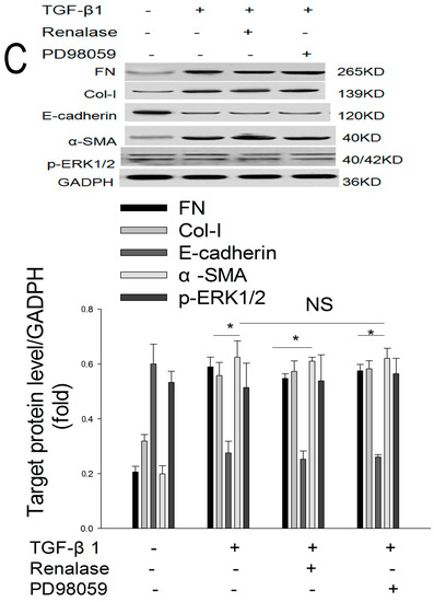 The role of ERK signaling pathway in the inhibition of EMT by renalase. (A) Results of plasmid transfection to overexpress ERK1. The transfection efficiency was observed with different doses of transfection reagents: low dose and high dose. Compared with control groups, the expression of p-ERK1/2 in the plasmid transfection groups were significantly higher than controls and the expression in the high dose group was higher than in the low dose group at 48 and 72 h. * p < 0.05, compared with control groups; # p < 0.05, compared with low dose groups. C: control group; L: low dose group; H: high dose group; NS: not statistically significant; (B) Effect of renalase on EMT and fibrosis induced by TGF-β1 in transfected cells. HK-2 were treated with plasmid and high dose transfection reagents in the presence or absence of TGF-β1 (2 ng/mL) and renalase (1000 ng/mL) as indicated for 48 h. Western blotting demonstrated that renalase cannot inhibit the increased expression of α-smooth muscle actin, collagen-I, and fibronectin and reverse the decreased expression of E-cadherin induced by TGF-β1 when ERK is overexpressed. * p < 0.05, compared with control groups; NS: not statistically significant between groups; (C) Effect of renalase and PD98059 on EMT and fibrosis induced by TGF-β1 in transfected cells. HK-2 were treated with plasmid and high dose transfection reagents in the presence or absence of TGF-β1 (2 ng/mL) and renalase (1000 ng/mL) or PD98059(20 µM) as indicated for 48 h. Western blotting demonstrated that the expression levels of p-ERK1/2 between groups were similar and that neither renalase nor PD98059 can inhibit the increased expression of α-smooth muscle actin, collagen-I, fibronectin or reverse the decreased expression of E-cadherin induced by TGF-β1 when ERK is overexpressed. * p < 0.05, compared with control groups. Results are presented as percentages of control values after normalization to GADPH and are the means ± SD of three independent experiments; n = 3 per group.
