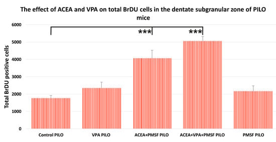 The results from the neurogenesis study indicated that the combination of ACEA + PMSF + VPA PILO as well as ACEA + PMSF PILO increased the total number of BrdU positive cells as compared to the control PILO group (Figure 2). As mentioned above, in the control PILO group the total number of BrdU positive cells in the dentate gyrus of mice averaged 1776 ± 150, while in ACEA + PMSF + VPA PILO mice the average value was 5056 ± 259 (F4,23 = 21.53; n = 5; p < 0.001; Figure 2), and for ACEA + PMSF PILO mice the average value was 4068 ± 457 (p < 0.001 for comparisons). No statistical significance was observed when comparing VPA PILO to the control PILO group (p > 0.05 for comparisons). Similarly, the total number of BrdU positive cells in PMSF PILO mice had no significant difference as compared to the control PILO group (p > 0.05 for comparisons).