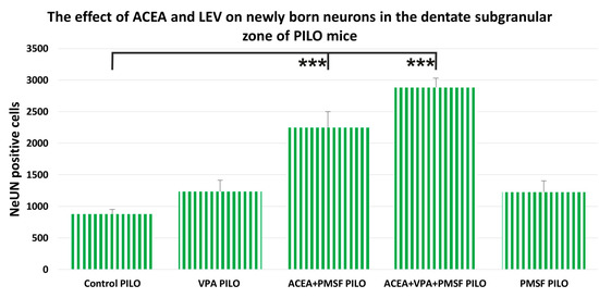 The results we obtained from this in vivo study showed a difference in the level of neurogenesis between healthy control mice and control mice with spontaneous seizures induced by pilocarpine injection. Moreover, we indicated that ACEA (10 mg/kg, i.p.) co-administered with PMSF (30 mg/kg, i.p.) significantly changed the total number of BrdU positive cells in PILO mice. The combination of ACEA + PMSF + VPA significantly enhanced BrdU positive cells of PILO mice. A 10-day treatment with VPA showed no significant influence on the process of neurogenesis as compared to the control PILO group. However, it should be emphasized that neurogenesis in the PILO control group is strongly decreased as compared to healthy control mice.