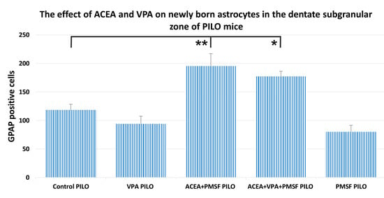 Both in the ACEA + PMSF + VPA PILO and ACEA + PMSF PILO group, a significant impact on newborn astrocytes was revealed (Figure 4) as compared to the control PILO mice. The average number of astrocytes for control PILO mice was 118 ± 10, whereas for ACEA + PMSF PILO-treated mice it was 195 ± 22, and the number of GFAP/BrdU positive cells for ACEA + PMSF + VPA PILO-treated mice averaged 177 ± 9 (F4,23 = 14.39; p < 0.01, p < 0.05, respectively; n = 5; Figure 4). VPA PILO mice showed a slight increase in GFAP positive cells when compared to the control PILO group, but the difference was not statistically significant (p > 0.05 for comparisons). The total number of GFAP positive cells in PMSF PILO mice was not significantly different compared to the control PILO group (p > 0.05 for comparisons).