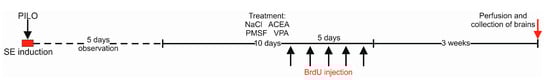 Schematic illustration of the experimental design used in the study. Experimental procedure: PILO—pilocarpine injection; SE—status epilepticus; ACEA—arachidonyl-2′-chloroethylamide; PMSF—phenylmethylsulfonyl fluoride; VPA—valproic acid; BrdU-5-Bromo-2-Deoxyuridine.