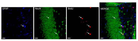 Bromodeoxyuridine (BrDU) positive cells in colocalization with NeuN and GFAP cells. The number of BrdU positive cells displaying astrocyte-specific (GFAP), neuron-specific (NeuN), BrDU-specific markers was determined using confocal microscopy to score the colocalization of BrdU and phenotypic indicators (MERGE-in orthogonal views) in representative sections from each animal. MERGE shows Z-axis projections of 23 μm × 1.32 μm. Bars: 20 μm.