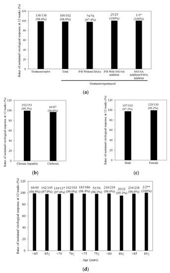 - Akuta, N.; Sezaki, H.; Suzuki, F.; Fujiyama, S.; Kawamura, Y.; Hosaka, T.; Kobayashi, M.; Kobayashi, M.; Saitoh, S.; Suzuki, Y.; et al. Ledipasvir plus sofosbuvir as salvage therapy for HCV genotype 1 failures to prior NS5A inhibitors regimens. J. Med. Virol. 2017. [Google Scholar] [CrossRef] [PubMed]