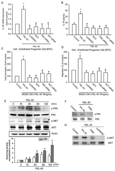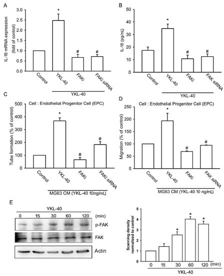2.2. YKL-40 Promotes IL-18 Expression and Stimulates EPC Angiogenesis through the FAK/PI3K/Akt Signaling Pathway