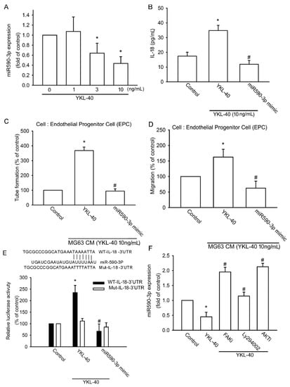 Chicago/Turabian StyleLi, Te-Mao, Shan-Chi Liu, Ya-Hsin Huang, Chien-Chung Huang, Chin-Jung Hsu, Chun-Hao Tsai, Shih-Wei Wang, and Chih-Hsin Tang. 2017. "YKL-40-Induced Inhibition of miR-590-3p Promotes Interleukin-18 Expression and Angiogenesis of Endothelial Progenitor Cells" International Journal of Molecular Sciences 18, no. 5: 920. https://doi.org/10.3390/ijms18050920