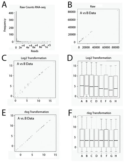 Another important issue relative to RNA-seq data sets is that they contain usually a large amount of low and disparate values. Thus, it is very important to be careful with the scale employed. If we use a raw data set, almost all data will plot on low values and only a few on higher values, thus occluding large parts of data (Figure 1A,B). This problem could affect techniques of Exploratory Data Analysis such as Principal Components Analysis or Cluster Hierarchical Analysis, since highly expressed genes could dominate them. To solve this issue, raw data has to be transformed numerically using, for example, Box-Cox Transformations or Logarithmic Transformations. In the present study, we used a data transformation similar to logarithmic transformation in base 2. Transformation shrinks data variation across samples. However, low-expression genes tend to over-dominate when this transformation is used. This is due, on one hand, to Poisson noise, related to low values of reads and, on the other hand, to the fact that logarithm transformation amplifies differences among low values. Thus, low-expression genes will show relatively larger differences among samples (Figure 1C,D). To solve this problem, we have used Regularized Logarithm Transformation (rlog). In this case, the outcomes of highly expressed genes are similar to outcomes obtained by logarithmic transformation in base two. In addition, differences among low values essentially disappear (Figure 1E,F).