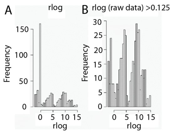 Gene expression level filtering. Histograms of data before (A) and after (B) the data set filtration process. Filtering was carried out by removing genes with a profile expression lower than 0.125 Reads per Kilobase per Millions of mapped reads (RPKM). Data are shown as rlog transformed.