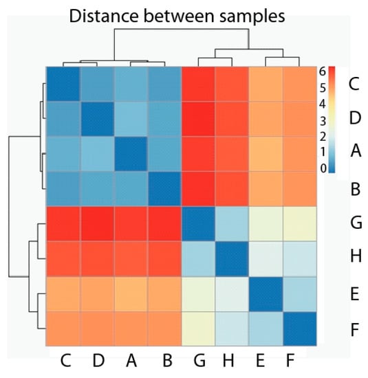 We first carried out the Hierarchical Cluster Analysis considering the eight samples used as observations and genes as variables. The dissimilarity measurement chosen is Euclidean distance, and the analysis is shown as a heatmap with dendograms in both axes of Figure 3. According to the map, it is clear that two groups have been formed, where the first one contains all four samples belonging to the normal, healthy phenotype (A, B, C, D), and the second one contains all four samples corresponding to the tumor phenotype (E, F ,G ,H) (Figure 3). The distance among samples belonging to the same phenotype is much smaller than the distance among samples belonging to different phenotypes. Each value represented in the heatmap corresponds with the distance between each sample couple.