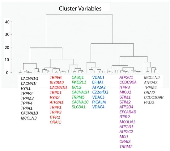 The gene transcripts studied include all ten voltage-operated Ca2+ channels (VOCCs); all seven well-established players involved in SOCE; all 27 TRP channels; all six Ca2+ release channels—including IP3 receptors and ryanodine receptor isoforms—all nine Ca2+ pumps including PMCAs, SERCAs and SPCAs; the three Na+/Ca2+ exchanger isoforms; all known genes involved in mitochondrial Ca2+ transport; and other related proteins. Clustering analysis segregated data in two different cell populations and genes were segregated into six independent gene families according to expression behavior. Overall, we found that 30 genes are expressed differentially in CRC cells relative to normal cells, thus providing a first comprehensive view of Ca2+ remodeling in CRC.
