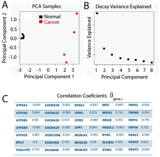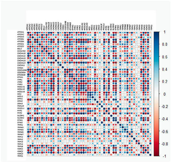 Next, we questioned possible correlations between gene couples. In this way, correlation values for each gene couple were plotted in the heatmap shown in Figure 5. Thus, in the case that two genes are positively and strongly correlated, if the expression of one of them is low in tumor samples, the expression of the other one will also be low in the normal sample. Conversely, if the pair of genes is negatively and strongly correlated and the expression of one of them is low in tumor samples, the expression of the other one would be very high in normal cells (Figure 5). Thus, for correlated genes, expression of one of them will allow prediction of the behavior of the correlated genes. For instance, MCU and MICU1 are very positively co-regulated with Orai2 and RYR1 and are thus extremely and negatively co-regulated with RYR2. Thus, when the expression of MCU and MICU1 increases, the expression of Orai2 and RYR1 will be also high, whereas the expression of RYR2 would be much lower. Nevertheless, not all genes are co-regulated, either positively or negatively, and there are many genes that are not co-regulated. For example, MCU and MICU1 do not co-regulate with ATP2A3, and they are almost uncorrelated with TRPM3 and TRPM4. Therefore, while the expression of MICU1 and MCU is enhanced in the tumor phenotype, the expression of ATP2A3, TRPM3 and TRPM4 seems not to vary much. Therefore, this analysis enabled us to uncover which genes behave in the same way and which do not when comparing healthy and tumor phenotypes. In addition, it can predict whether or not the behaviors are similar.