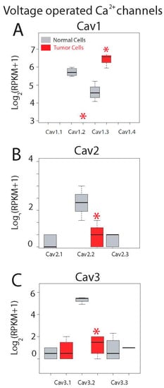 Finally, Cav3.1 to Cav3.3 are T-type Ca2+ channels activated only at high potentials and expressed typically in cardiac and smooth muscles as well as in some neurons. Only Cav3.2 is expressed in normal colonic cells and expression is also nearly lost in CRC cells (Figure 7C). Interestingly, it has been shown recently that blockers of T-type channels may prevent colon cancer growth []. Thus, transcripts of Cav1.2, Ca1.3, Cav2.2 and Ca3.2 are differentially expressed in normal colonic and CRC cells. In any case, we must take into account that expression of these channels at the protein level may or may not correlate with expression at the messenger level.