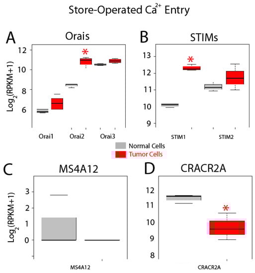 Gene expression levels for molecular players involved in SOCE are shown in Figure 8. Store-operated Ca2+ entry, also named capacitative Ca2+ entry, is activated after agonist-induced emptying of intracellular Ca2+ stores. This pathway is mediated by interactions between STIM sensors at the ER and Orai channels at the plasma membrane. All three Orais are expressed in both normal and colon cancer cells and expression appears to be increased for all of them (Figure 8A). However, only differences for Orai2 mRNA are significant in tumor cells (Figure 8A). STIM and 2 are also expressed in normal and colon cancer cells (Figure 8B). Interestingly, STIM1 is significantly enhanced in tumor cells, whereas STIM2 remains similar (Figure 8). In addition to these players, MS4A12 has been reported to be a colon-selective store-operated Ca2+ channel promoting malignant cell processes []. However, MS4A12 mRNA is barely or not expressed either in normal cells and CRC cells (Figure 8C). Finally, CRACR2A, a SOCE regulatory protein [], is expressed in both normal and tumor cells and expression levels are diminished in tumor cells (Figure 8D).