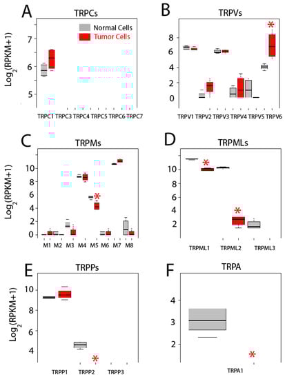Expression of transient receptor potential (TRP) channels in normal and colon cancer cells. Expression levels of canonical transient receptor potential channels TRPCs (A), canonical Transient Receptor Potential channels (TRPVs) (B), Melastatin Transient Receptor Potential channels (TRPMs) (C), Mucolipin Transient Receptor Potential channels (TRPMLs) (D), Polycystin Transient Receptor Potential channels (TRPPs) (E) and Transient Receptor Potential channel member A, subfamily 1 (TRPA1) (F) in normal colonic cells (grey bars) and colon cancer cells (red bars). * p statistically significant by three independent methods.