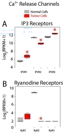 Expression of Ca2+ release channels is shown in Figure 10. IP3 and ryanodine receptors are Ca2+ release channels at the ER, the most important intracellular Ca2+ store. There are three IP3 receptor (IP3R) subtypes, IP3R1 to IP3R3, and all of them are expressed in both normal colonic and colon cancer cells (Figure 10A). Interestingly, all three isoforms are also differentially expressed in colon cancer cells relative to normal cells. While genes corresponding to IP3R1 and IP3R3 are overexpressed in colon cancer cells, gene coding for IP3R2 is downregulated (Figure 10A). Interestingly, consistent with these results, it has been reported that the type III IP3R is absent in normal colonic cells but is expressed in colon cancer. Moreover, expression levels are directly related to aggressiveness of the tumor []. In addition, it has been also reported that depletion of mutated K-Ras in a colon cancer cell line changes Ca2+ store content and susceptibility to apoptosis by promoting changes in expression of IP3R isoforms []. Therefore, IP3Rs are critical players in Ca2+ remodeling in colon cancer, contributing likely to changes in Ca2+ store content and susceptibility to apoptosis.