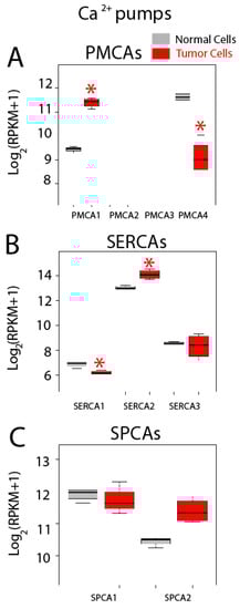 Gene expression levels for Ca2+ pumps including PMCAs, SERCAs and SPCAs are shown in Figure 11. Regarding genes coding for PMCAs, we found that only PMCA1 and PMCA4 are expressed in both normal and colon cancer cells, while PMCA2 and PMCA3 are absent in both cell types (Figure 11A). Interestingly, PMCA1 expression increases in cancer cells while expression of PMCA4 is downregulated in tumor cells (Figure 11A). Thus, data suggest a molecular switch from PMCA4 to PMCA1 in CRC. These results are consistent with a previous report showing that undifferentiated colonic cell lines express PMCA1 and differentiation downregulates it while promoting expression of PMCA4 [].