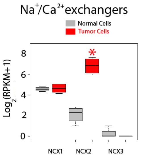 Expression of Na+/Ca2+ exchanger isoforms in normal and colon cancer cells. Expression levels of NCXs in normal colonic cells (grey bars) and colon cancer cells (red bars). * p statistically significant by three independent methods.