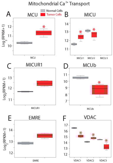 Gene expression levels for molecular players involved in mitochondrial Ca2+ transport are shown in Figure 13. Ca2+ enters mitochondria down its electrochemical gradient through the mitochondrial Ca2+ uniporter (MCU) that is modulated by several regulatory proteins including mitochondrial Ca2+ uptake (MICU) isoforms 1 to 3, mitochondrial calcium uniporter regulator 1 (MICUR1), mitochondrial calcium uniporter dominant negative beta (MCUb) and MCU regulator (EMRE). Voltage-dependent anion channels (VDAC) 1 to 3 in the outer mitochondrial membrane have been involved in apoptosis. Interestingly, messengers involved in mitochondrial Ca2+ transport are very highly expressed in both normal and CRC cells (Figure 13). In addition, all genes but MICU3 are expressed in both normal and tumor cells (Figure 13). Expression of the channel MCU and its positive modulator MICU1 is enhanced in tumor cells (Figure 13A,B), while expression of negative modulator MICU2 is decreased. Expression of other MCU modulators including MICUR1 and EMRE is similar (Figure 13B,C,E), while MCUb is significantly downregulated in colon cancer cells (Figure 13D). Finally, all three VDACs are expressed at very high levels in both normal and tumor cells (Figure 13F). Interestingly, expression of all of them is significantly different in colon cancer cells. VDAC1 and 3 are downregulated in colon cancer cells while VDAC2 is significantly overexpressed in cancer cells.