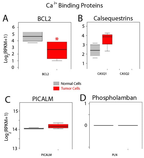 Finally, expression of other related proteins is shown in Figure 14. Bcl-2 modulates Ca2+ release and apoptosis. This gene is significantly downregulated in cancer cells (Figure 14) while expression of two other proteins including calsequestrin 1 and phosphatidylinositol binding clathrin assembly protein (PICALM), is similar (Figure 14B,C). No expression of calsequestrin2 and phospholamban is observed in normal and colon cancer cells.