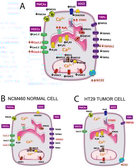 Molecular players differentially expressed in NCM460 normal colonic and HT29 colorectal cancer cells. Genes significantly upregulated (↑) and downregulated (↓) in colorectal cancer cells vs. normal colonic cells are shown in specific locations in the plasma membrane, the endoplasmic reticulum (ER) and mitochondria (A). To best appreciate the differences, molecular players downregulated in cancer cells have been removed in the prototypical, normal colonic cell (B), whereas only genes upregulated in CRC are shown in the prototypic CRC cell (C). Molecular players in red are those with the largest fold changes in expression from the normal to the tumor phenotype. PMCAs, plasma membrane calcium ATPases; VOCCS, voltage-operated calcium channels; SOCE, store-operated calcium entry; TRPs, Transient Receptor Potential channels.