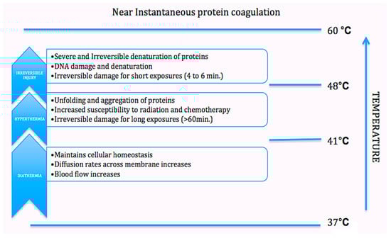 Schematic illustrating biological effects linked to stage-wise thermal increments with corresponding temperature rise.