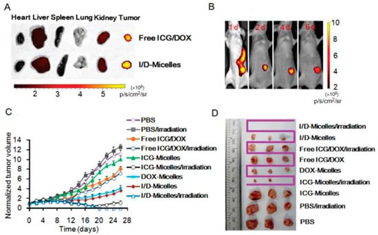Preclinical test results showing ex vivo and in vivo imaging and photothermal effect measurement of indocyanine green (ICG)-micelle with or without doxorubicin (DOX) drug loaded nanoparticles. (A) Ex vivo imaging of ICG from free ICG/DOX and ICG/DOX-micelles in heart, liver, spleen, lung, kidney, and tumor of the mice at 24 h post-injection at the dose of 7.5 mg/kg ICG/DOX, respectively; (B) In vivo near-infrared fluorescence (NIRF) imaging of the mice bearing A549 tumor injected with I/D-micelles at the dose of 7.5 mg/kg ICG/DOX at 1, 2, 4, and 6 days post-injection, respectively; (C) Tumor growth inhibition profiles of the mice bearing A549 tumor injected with various formulations; (D) Photographic view of tumors extracted from the mice bearing A549 tumor at the end of the experiment. Figure adapted from [].