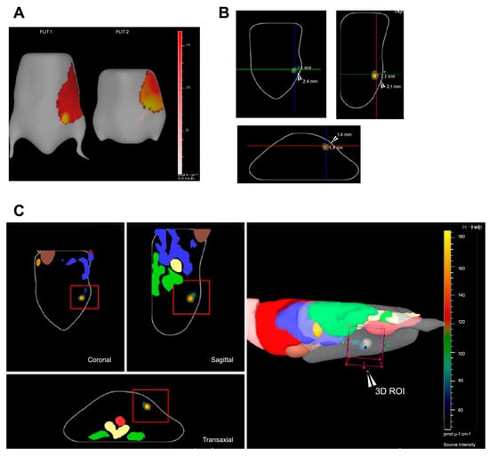 In recent times, 3D in vivo tomography approaches (for small animal models) include PTOCT (Photothermal Optical Coherence Tomography) [] and PAOCT (Photoacoustic Optical Coherence Tomography) []. These approaches are used for tissue imaging and, with the aid of external magnetic field(s), are fundamental in the development of tumor models, MMOCT (magneto-motive OCT) []. Ever since, a variety of instruments for 3D FLIT (fluorescence imaging tomography) have been developed, the most notable of which is the IVIS Spectrum in vivo Imaging System™ (PerkinElmer). Based upon our experiences in 3D in vivo imaging experimentation using this system, it has proven to be utilitarian in finding the following parameters.