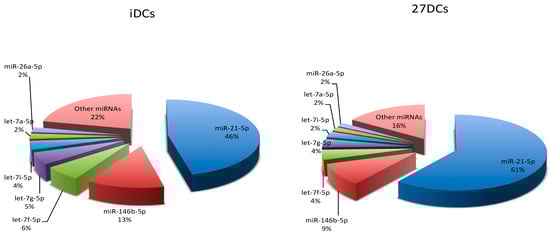 miRNA raw read counts were normalized by count-per-million (CPM) using EdgeR [26]. The relative number of sequence reads for each miRNA (percentage in the sample) indicated their abundance in each sample. Seven miRNAs (miR-21-5p, miR-146b-5p, let-7f-5p, let-7g-5p, let-7i-5p, let-7a-5p, and miR-26a-5p) that were highly expressed are shown in Figure 1. Their abundance accounted for 78% and 84% of the total miRNA reads in iDCs and 27DCs, respectively. Interestingly, miR-21-5p represented around 50% of the total miRNA pool in both iDCs and 27DCs. Its expression in 27DCs was 14% higher than in iDCs. The expression of miR-146b-5p, let-7g-5p, let-7f-5p, and let-7i-5p was down-regulated by IL-27 (not significantly).
