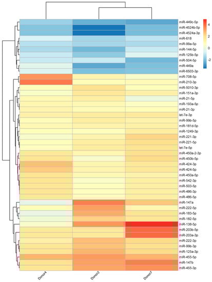 Cutadapt [52] was used to remove adaptors and trim reads with a Phred quality score threshold of 30 (Q30) and length threshold of 17–35 bp producing a set of “clean” reads for each sample. The “clean” reads were mapped to the human reference genome hg38 using the Burrows–Wheeler aligner, BWA (v0.7.10-r789) [53] with one mismatch as recommended by others [54]. Known miRNA read counts were determined by bedtools multicov [55] with miRBase (v21) [56]. The read count matrix was analyzed using the edgeR package 3.16.5 [57] in R version 3.2.3, where general linear model (GLM) was designed with donors+treatment for paired sample comparisons. Resulting p-values were corrected with Benjamini and Yekutieli correction. The significant miRNAs were selected based on fold change >1.5 or <−1.5, false discovery rate (FDR) <0.05 and at least one sample count (maximum read count) >50. A heat map was generated by pheatmap 1.0.8 [58] using log2 fold change from log2 counts per million (logCPM) by edgeR.