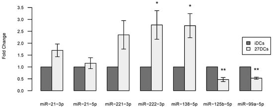 RT-qPCR validation of seven differential miRNAs in three different donors (Donor 22, 24, and 27). The expression level of each miRNA was normalized to RNU44 and converted to fold change (27DCs vs. iDCs). miRNA expression in 27DCs (gray) relative to iDCs (black) for seven miRNAs are shown. Error bars represent standard error (SE). * denotes p-values < 0.05 and ** denotes p-values < 0.01 for differences in miRNA expression between iDCs and 27DCs. A two-tailed t-test was used to calculate the p-values.