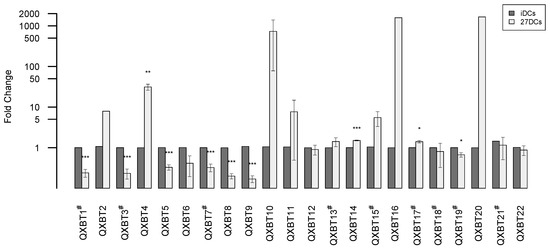 To validate the expression levels of the novel miRNA candidates, advanced and traditional Taqman miRNA RT-qPCR assays were performed on three independent donors. In the advanced assay, a universal RT primer is used to generate cDNA while, in the traditional assay, a gene-specific RT primer (Figure S5) is used. Therefore, the traditional assay may have a higher sensitivity than the advanced assay. The advanced assay was used initially, but after some samples failed, tests were repeated with the traditional assay. Finally, 13 out of 22 miRNAs were successfully confirmed with the advanced assay, while the other nine miRNAs were successfully confirmed with the traditional assay (Figure 4). From the RT-qPCR data, three of the novel miRNAs were significantly up-regulated in 27DCs and seven were significantly down-regulated in 27DCs. The t-test results for QXBT10 and QXBT15 were not significant due to a large range of variability between donors. Some novel miRNAs (QXBT2, QXBT16, and QXBT20) were not found in all samples using the advanced method. This could be a method sensitivity issue or potentially, the miRNA expression was donor dependent. Interestingly, two miRNAs (QXBT16 and QXBT17) with very low read counts (maximum read count of six and two, respectively) were confirmed.
