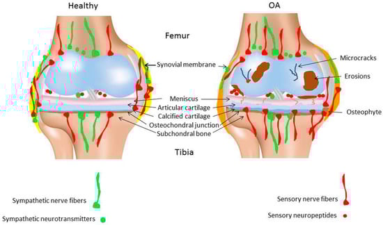 It is unclear if sensory nerve fiber density during OA pathogenesis changes and whether the sensory fiber profile is different from healthy joints. In a murine OA model (intraarticular injection of collagenase), CGRP- and SP-positive nerve fibers disappeared 5 weeks after induction of OA [41] In a similar OA model, Murakami et al. reported that the densities of protein gene product (PGP) 9.5- and CGRP-positive nerve fibers in the synovium were drastically decreased just one week after the collagenase injection [42]. This aggressive and painful method of OA induction leads to various degenerative alterations in synovial joint tissues (among other soft tissues) after a few weeks. In contrast to these reports, some studies on human knee OA revealed an increase in SP- and CGRP-positive nerve fiber density in the synovial tissue [38,39,43], whereas others have described a decrease of these nerve fibers in the synovium [44]. As most of these studies are undertaken in late-stage chronic OA, there is not much known about a potential association between the pathological changes in knee tissues and changes in these nociceptive fibers innervation profile during the early acute phase of the disease. It is likely that the normal vascular and neural network in early or late OA stages is altered, however, the underlying molecular mechanisms have not yet been identified. In the same line, it is unknown if nerves are destroyed as a consequence of OA or if pathogenesis of OA is facilitated due to nerve disappearance (Figure 1).