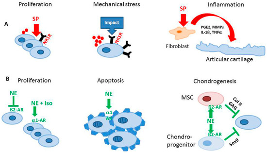Effects of sensory and sympathetic neurotransmitters on chondrocytes. Changes in local innervation pattern of sensory and sympathetic nerves related to OA leading to altered neuropeptide microenvironments can alter chondrocyte behavior and metabolism contributing to the observed OA phenotype. (A) Substance P increases proliferation of chondrocytes indicating anabolic effects. Application of mechanical load increases expression of NK1-R and endogenous synthesis of substance P. Stimulation of synovial fibroblasts with SP induces release of inflammatory mediators, promoting cartilage degradation. (B) β2-AR signaling inhibits proliferation of chondrocytes whereas α1-AR signaling induces proliferation, implying dual effects of the sympathetic nervous system. NE signalling via α1-AR induces apoptosis of chondrocytes and signal transduction via β-AR inhibits chondrogenic differentiation of MSC and chondroprogenitor cells. GAG: Glycosaminoglycans; Col II: Collagen II; SP: Substance P; PGE2: Prostaglandine E2; MMP: Matrix metalloproteinase; IL: Interleukin; TNF: Tumor necrosis factor; NE: Norepinephrine; AR: Adrenoceptor; Iso: Isoproterenol; NK1-R: Neurokinin receptor 1; MSC: Mesenchymal stem cell.