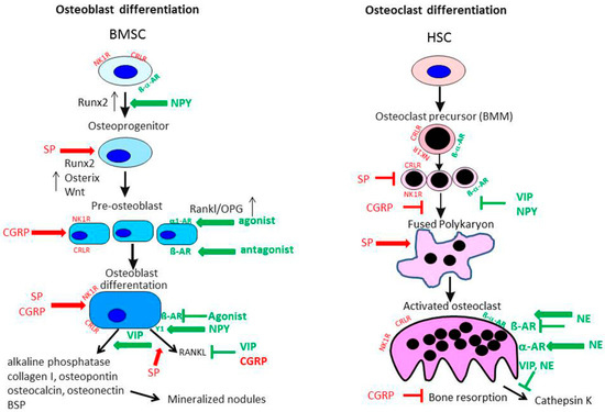 Effects of the sensory and sympathetic nervous system on osteoblast and osteoclast metabolism. Both sensory and sympathetic neurotransmitters affect the differentiation process and activity of osteoblasts and osteoclasts/BMM in many different ways. Modified from [11]. BMM: bone marrow-derived macrophages; SP: substance P; NE: norepinephrine; AR: adrenoceptor; NK1-R: neurokinin receptor 1; BMSC: mesenchymal stem cell; NPY: neuropeptide Y; CGRP: calcitonin gene-related peptide; VIP: vasoactive intestinal peptide; OPG: osteoprotegerin; Rankl: receptor activator of nuclear factor κB ligand; CRLR: calcitonin receptor-like receptor; BSP: bone sialoprotein; HSC: hematopoietic stem cells.