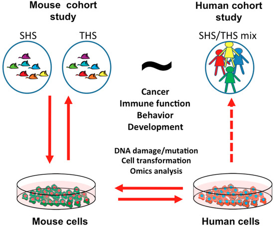 We propose that an integrative systems biology approach will provide a comprehensive evaluation of the biological and health effects of exposure to THS. Since direct human studies linking THS to human risks and diseases are virtually impossible, model systems, such as mouse models, will serve as valuable tools. Since infants and toddlers living in a smoking household are normally exposed to mixed SHS and THS, mouse studies can separately study the effects of SHS and THS exposure in a well-controlled environment, as shown in Figure 2. The animal studies should be coordinated with in vitro experiments, e.g., comparing effective concentrations in vitro to serum or tissue levels in animals and comparing the effects between mouse and human cells. This “parallelogram strategy” capitalizes on the strengths of complementary in vivo and in vitro mouse and human systems, especially the use of well-defined human cohort studies (see Figure 2).