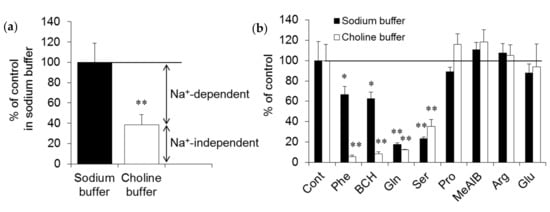 Characteristics of 14C-fluciclovine transport in MRMT-1 cells. (a) Contributions of Na+-dependent and -independent carriers on the uptake of 14C-fluciclovine. The transport of 14C-fluciclovine in sodium buffer was normalized to 100%. (b) Competitive inhibition of 10 μmol/L 14C-fluciclovine transport by naturally-occurring and synthetic amino acids (2.0 mmol/L). The control transport (absence of inhibitors) of 14C-fluciclovine in sodium and choline buffer was normalized to 100%. Each bar represents the mean ± standard deviation (SD) (n = 6). * p < 0.05, ** p < 0.01. Arg: arginine, BCH: 2-amino-bicyclo[2,2,1]heptane-2-carboxylic acid, Cont: control, Gln: glutamine, Glu: glutamate, MeAIB: 2-(methylamino)-isobutyric acid, Phe: phenylalanine, Pro: proline, Ser: serine.