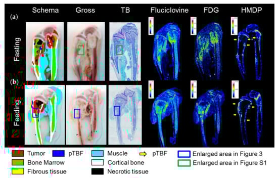 Triple-tracer autoradiography using 14C-fluciclovine, 2-deoxy-2-18F-fluoro-d-glucose (3H-FDG), and 99mTc-hydroxymethylene diphosphonate (99mTc-HMDP) in breast cancer bone metastasis model rats. Macroscopic images (schema, gross, toluidine blue (TB) staining) and autoradiograms of each tracer in (a) fasting and (b) fed rats are shown. Each image was adjusted for optimal contrast and color scale bars on each autoradiogram represent Bq range for each tracer. The high-power microscopic fields of typical osteolytic and osteoblastic lesions corresponding to the blue and green frames on the macroscopic images in Figure 2a,b are shown in Figure 3 and supplementary Figure S1, respectively. The lesions correspond to 99mTc-HMDP-positive areas, except for physiological accumulation in growth plates, which were considered peri-tumor bone formation (pTBF) in osteoblastic lesions (yellow arrows).