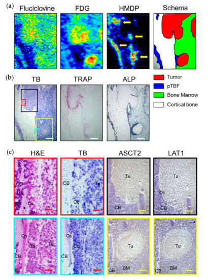 Comparison of the tracer accumulations of 14C-fluciclovine, 2-deoxy-2-18F-fluoro-d-glucose (3H-FDG) and 99mTc-hydroxymethylene diphosphonate (99mTc-HMDP), and the histological characteristics of typical osteolytic and osteoblastic lesions in a representative breast cancer bone metastasis model rat that was fed. (a) The enlarged autoradiograms and the schema and (b) the histological images (toluidine blue (TB), tartrate-resistant acid phosphatase (TRAP), alkaline phosphatase (ALP)) correspond to the blue frame on the schema in Figure 2b are represented. The lesions corresponding to 99mTc-HMDP-positve were considered peri-tumor bone formation (pTBF) in osteoblastic lesions (yellow arrows). (c) The high-power microscopic fields (hematoxylin and eosin (H&E), TB, alanine-serine-cysteine transporter 2 (ASCT2), L-type amino acid transporter 1 (LAT1)) correspond to the black, red, yellow, and cyan frames on the TB image in Figure 3b are shown. The red, yellow, and white scale bars on each panel correspond to 50 μm, 200 μm, and 500 μm, respectively. BM: bone marrow, CB: cortical bone, Ob: osteoblasts, Oc: osteoclasts, Os: osteoids, Tu: tumor.