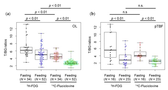 Beeswarm and box plots showing the distributions of targetmean (metastatic lesion)-to-backgroundmean (muscle) (T/BG) ratios of 2-deoxy-2-18F-fluoro-d-glucose (3H-FDG) and 14C-fluciclovine in (a) osteolytic lesions (OL), and (b) peri-tumor bone formation (pTBF) in osteoblastic lesions in breast cancer bone metastasis model rats, with and without overnight fasting. The numbers under each box indicate the number of lesions. n.s.: not significant.