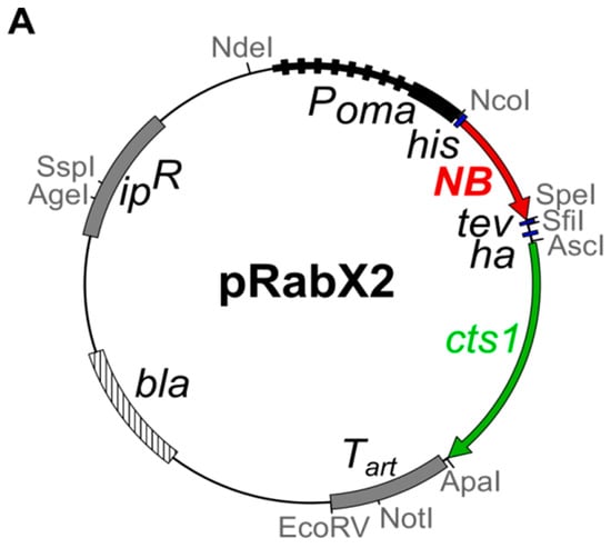 To evaluate if functional nanobodies can be produced by Cts1-mediated secretion we chose the green fluorescent protein Gfp as a first antigen. A nanobody directed against Gfp (αGfpNB) has been described in an earlier study []. For expression, the respective sequence was adapted to the context-dependent dicodon-usage of U. maydis (Table S1). This strategy was chosen because in U. maydis premature mRNA polyadenylation has been observed for non-optimized genes []. In addition, we prefer dicodon optimization, since not only the codon bias but also the neighbouring nucleotides can influence the choice of this codon from the synonymous group []. The optimized gene was inserted into the integrative expression vector pRabX2 (Figure 1A) []. In this vector, the gene of interest is translationally fused with the cts1 gene. The encoded fusion protein harbours an N-terminal Histidin (His) tag for purification and an internal HA tag for detection. In addition, the Cts1 carrier can be removed using an internal Tobacco Etch Virus (TEV) protease cleavage site to generate a more natural product with only a small epitope tag (His tag). Gene expression is controlled by the very strong, constitutive, synthetic Poma promoter []. The pRabX2 derivative encoding the αGfpNB-Cts1 fusion was inserted into the ip locus of strain AB33 and the two protease deficient strains AB33kex2Δ and AB33P5Δ by homologous recombination [,].