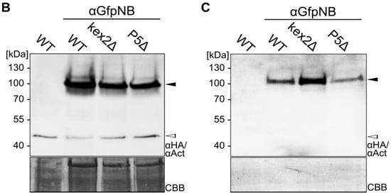 To investigate if the αGfpNB-Cts1 fusion protein was produced and secreted, cell extracts and cell-free culture supernatants of the three strains were generated and analysed by Western blot (Figure 1B,C). The 76-kDa protein was present in all cell extracts (Figure 1B). As observed earlier, the Cts1-fusion protein was migrating higher than expected []. The amount of extracellular αGfpNB-Cts1 differed depending on the strain background: AB33kex2Δ/αGfpNB-Cts1 showed elevated amounts compared to AB33 αGfpNB-Cts1 and AB33P5Δ/αGfpNB-Cts1 (Figure 1C). While it is not clear why AB33P5Δ/αGfpNB-Cts1 shows a lower protein amount, this was expected for AB33, because this strain still carries all harmful proteases []. Although eventually a degradation band was observed which likely accounts to the activity of remaining proteases, AB33kex2Δ/αGfpNB-Cts1 was used for all further experiments, because it contained the highest amount of full-length protein in the culture supernatant (Figure 1C and Figure S1).