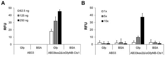 Biochemical characterization of the αGfp nanobody. (A) Detection of purified His-tagged green fluorescent protein (GfpH) in enzyme-linked immunosorbent assays (ELISA) using 10 µg of whole cell extracts of strain AB33 (no nanobody) and the Kex2-deficient nanobody expression strain AB33kex2Δ/αGfpNB-Cts1; (B) Detection of purified GfpH in ELISA assays using distinct volumes of immobilized metal affinity chromatography (IMAC)-purified fractions obtained from supernatants of strains AB33 (no nanobody) and AB33kex2Δ/αGfpNB-Cts1. ELISA were performed in biological triplicates. BSA, bovine serum albumin; RFU, relative fluorescence units.