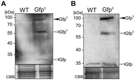 Western blot analyses using an αGfp nanobody produced in U. maydis. (A) Detection of triple-Gfp (Gfp3) by Western blot analysis using the αGfpNB-Cts1 fusion protein enriched from cell extracts of strain AB33kex2Δ/αGfpNB-Cts1; (B) Detection of Gfp3 by Western blot analysis using αGfpNB-Cts1 enriched from culture supernatants of strain AB33kex2Δ/αGfpNB-Cts1. Besides Gfp3 (black arrowheads) its degradation products Gfp2 and single Gfp (open arrowheads) were also detected.