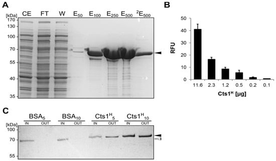 Chitin-binding activity of recombinant Cts1. (A) SDS-PAGE analysis of fractions obtained from IMAC purification of His-tagged Cts1 (Cts1H) produced in Escherichia coli. CE, cell extract; FT, flow through; W, wash step; E, elution fractions using different concentrations of imidazole (subscripts). Cts1H is depicted with a black arrowhead; (B) Chitin activity assay with distinct amounts of IMAC purified Cts1H. Activity was determined by monitoring the change in fluorescence using the fluorogenic chitinase substrate 4-methylumbelliferyl β-d-N,N′,N′′-triacetylchitotrioside (4-MUC). RFU, relative fluorescence units; (C) Chitin-binding activity of distinct amounts (5 or 10 µg) of purified Cts1H (indicated by black arrowhead). Equal amounts of purified BSA (NEB, Ipswich, MA, USA) were used as a negative control (depicted by open arrowhead). Chitin Magnetic Beads were mixed with respective proteins (IN), washed rigorously and bound protein was eluted using Laemmli buffer (OUT).