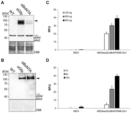 Expression and unconventional secretion of an αBoNTA nanobody. (A,B) Comparative Western blot analysis of whole cell extracts (A) and volumetric precipitated supernatants (B) of the nanobody-Cts1 fusion proteins αGfpNB-Cts1 (αGfp) and αBoNTANB-Cts1 (αBoNTA) produced in strain background AB33kex2Δ. The strain AB33kex2Δ (WT) lacking expression constructs was included as negative control. Proteins were detected using an αHA primary antibody. Actin-specific antibodies (αAct) were used as loading control (open arrowhead). The membranes were stained with CBB after detection. Full length protein bands were obtained for both αBoNTANB-Cts1 (black arrowhead, 74 kDa) and αGfpNB-Cts1 (76 kDa); (C) Distinct amounts of whole cell extracts derived from AB33 and AB33kex2Δ/αBoNTANB-Cts1 were analyzed by ELISA using botulinum toxin A (BoNTA) as antigen; (D) Elution fractions from IMAC purifications of AB33 and AB33kex2Δ/αBoNTANB-Cts1 supernatant were analyzed in different concentrations (10×, 5×, 1×) by ELISA against BoNTA. ELISA were performed in biological triplicates. RFU, relative fluorescence units.