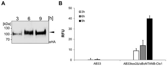 For initial experiments and biochemical characterization, nanobody expression cultures were harvested at low optical densities (0.5–1). This yielded low levels of secreted protein. To characterize the behavior of cultures grown to higher optical densities, we incubated the expression strain AB33kex2Δ/αBoNTANB-Cts1 for 9 h in shake flask batch cultures, corresponding to a final optical density of about 3.0. Western blot analyses using volumetric samples taken at different time-points now showed increasingly strong bands for the full length protein (Figure 7A). In line with that, ELISA assays demonstrated increasing signals of the samples harvested over time (Figure 7B). To determine the approximate amount of αBoNTANB-Cts1 secreted in the batch culture, quantitative Western blot analyses were performed using a dilution series of commercial MultiTag® Protein (GenScript, Piscataway, NJ, USA) as an internal standard (Figure S5). According to this quantification, a yield of about 140 µg/L was achieved in the standard batch culture.