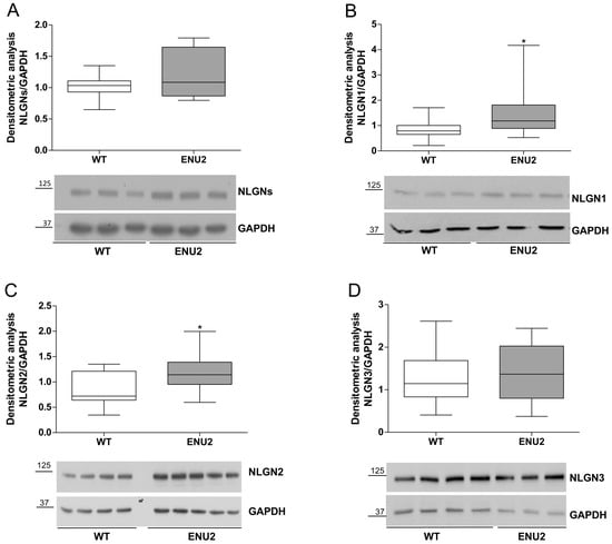 Neuroligins (NLGNs) levels in the pFC of ENU2 mice. Protein levels were quantified by densitometry after western blot analysis for total NLGNs and for NLGN1, 2, and 3 family members. Values were normalized to GAPDH loading control and are represented as a box plot of their distribution (min/max e median). (A) NLGNs (WT n = 7, ENU2 n = 8, p = 0.2162); (B) NLGN1 (WT n = 18, ENU2 n = 13, p = 0.0142); (C) NLGN2 (WT n = 13, ENU2 n = 14, p = 0.0266); and (D) NLGN3 (WT n = 17, ENU2 n = 14, p = 0.5430). Statistical analysis compared ENU2 values versus WT (* p < 0.05). Representative images of western blot analysis are shown. Molecular masses are indicated on the blots in kDa.
